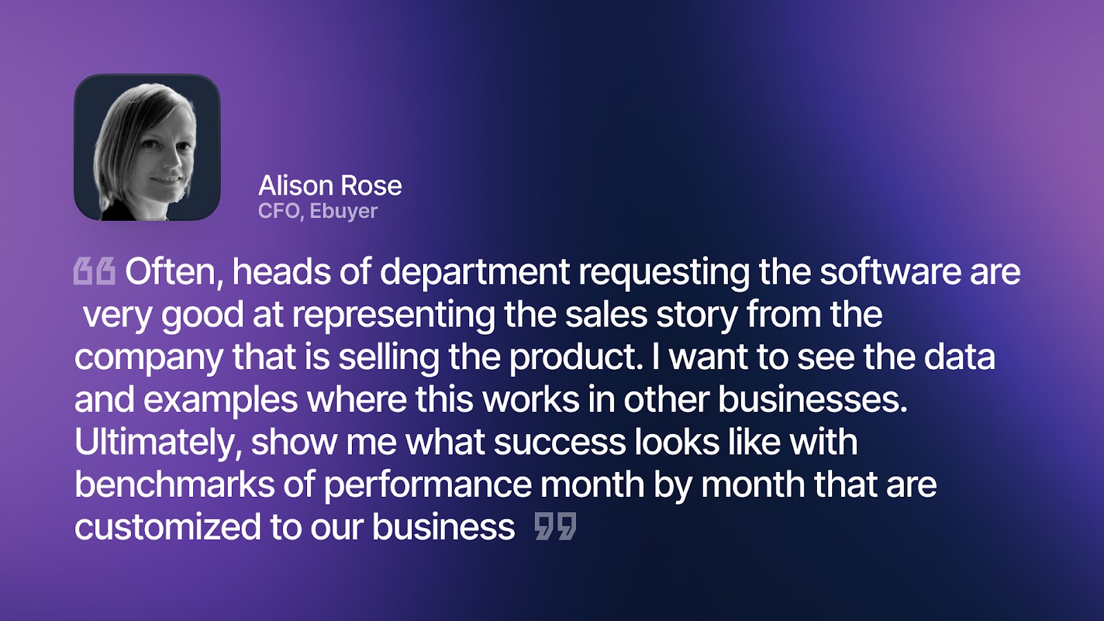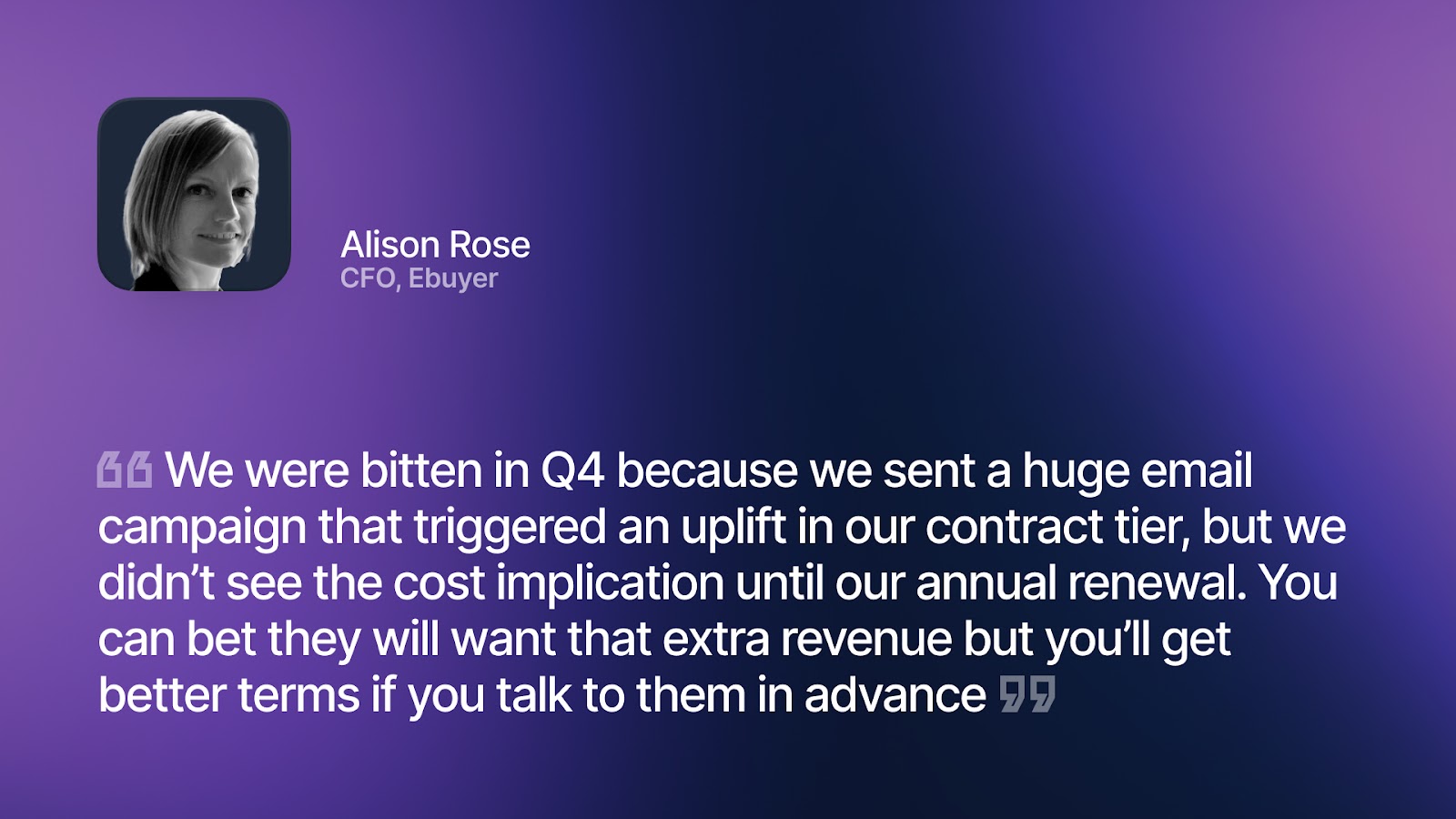 Ecommerce businesses have notoriously tight margins, so every penny spent on SaaS must have a clear link to growth. Before committing to any software spend, Alison recommends CFOs carefully consider whether a tool will provide trackable contributions to revenue uplift.