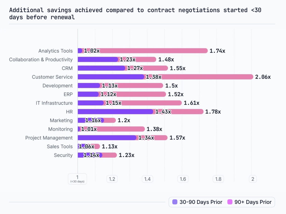 Our data shows that by engaging with the vendor at least 90 days prior to the contract renewal date, you can achieve significantly better savings.