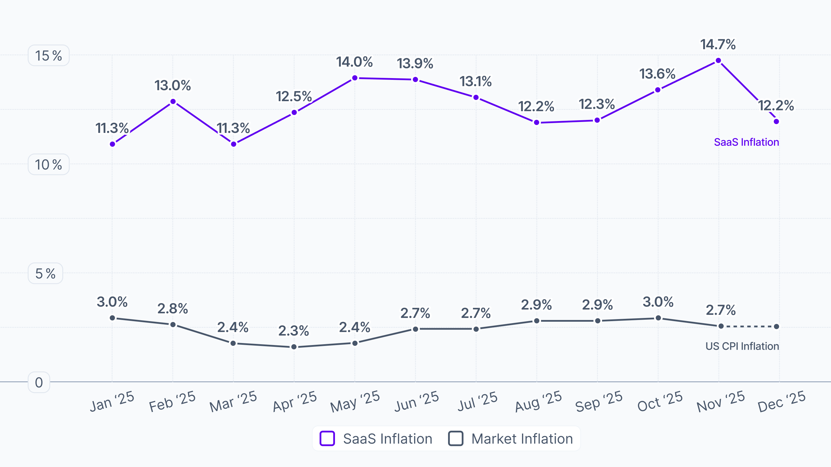 SaaS costs remained elevated through Q4 2025, with year-over-year increases of 13.6% in October, 14.7% in November and 12.2% in December, averaging 13.5% growth for the quarter.