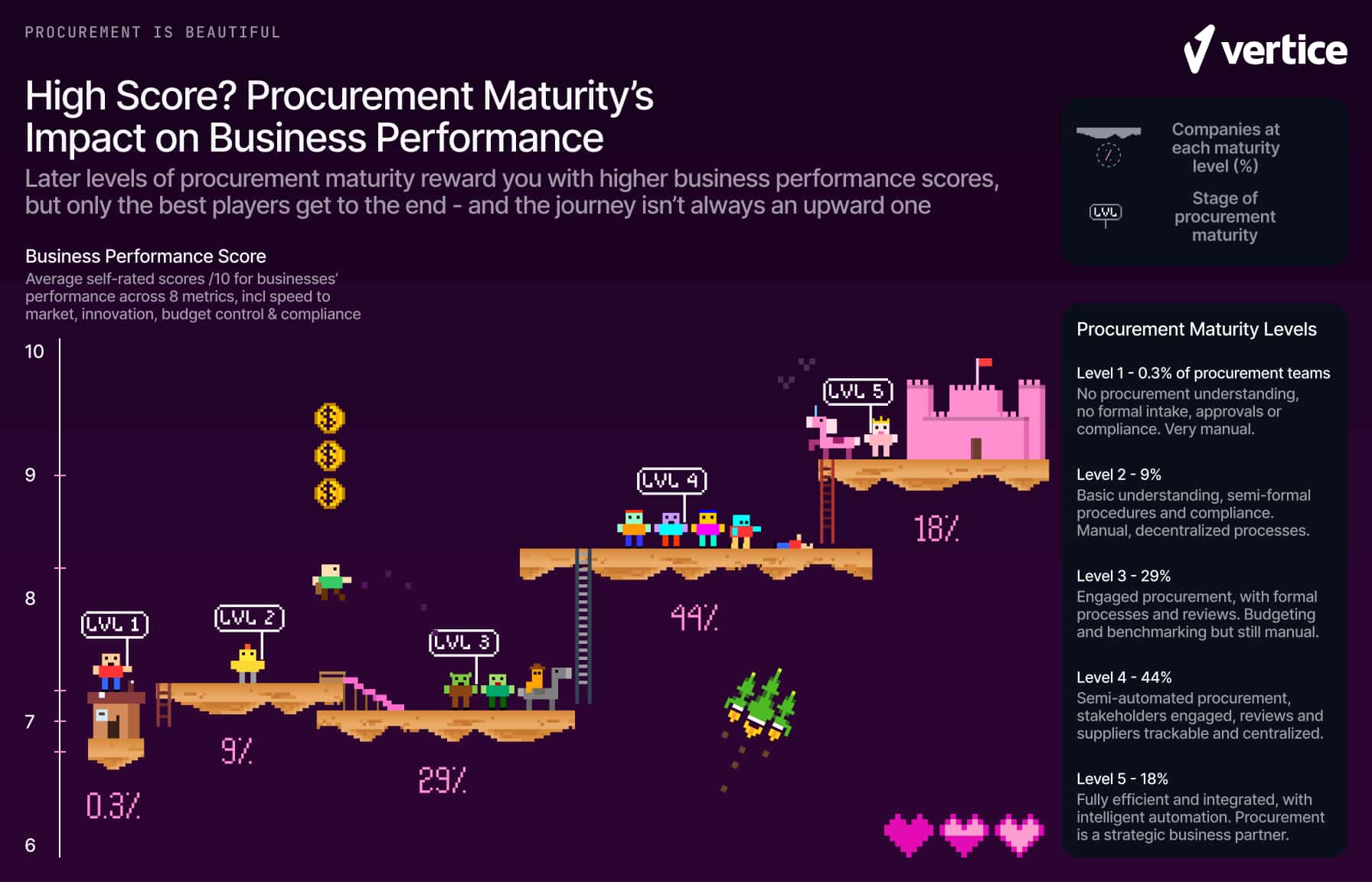 Survey respondents rated the quality of their procurement processes across 8 key areas - ranging from routing and intake to supplier relationship management - and Vertice used this data to calculate the organization’s overall “procurement maturity”.