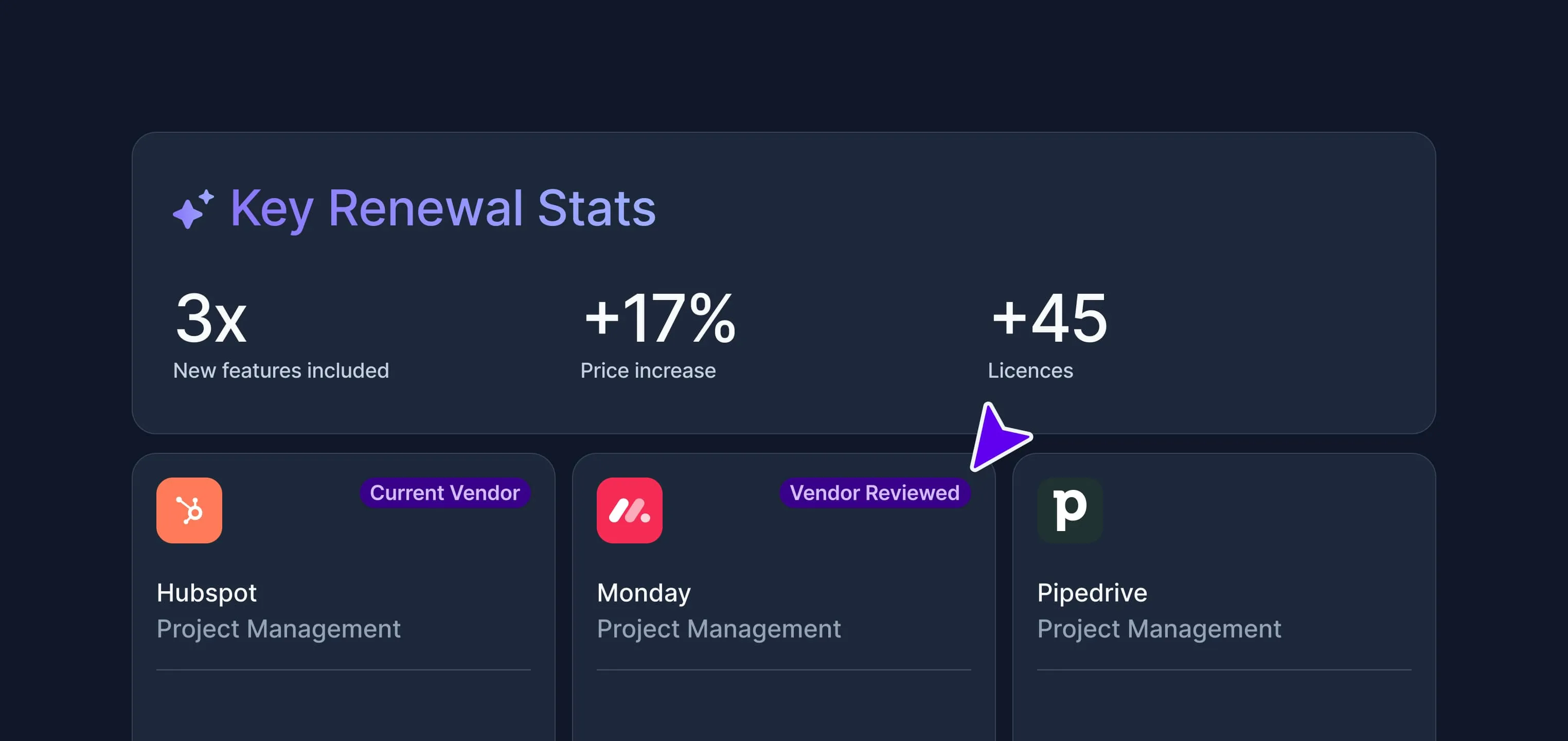 Vertice centralizes vendor data and contract information, giving procurement teams a clear view of all active agreements, including those in their SaaS stack. With insights into pricing, usage, and compliance, teams can proactively manage contract renewals, strengthen supplier negotiations, and maintain healthier vendor relationships – all while ensuring cost control and reducing the risk of overspending.