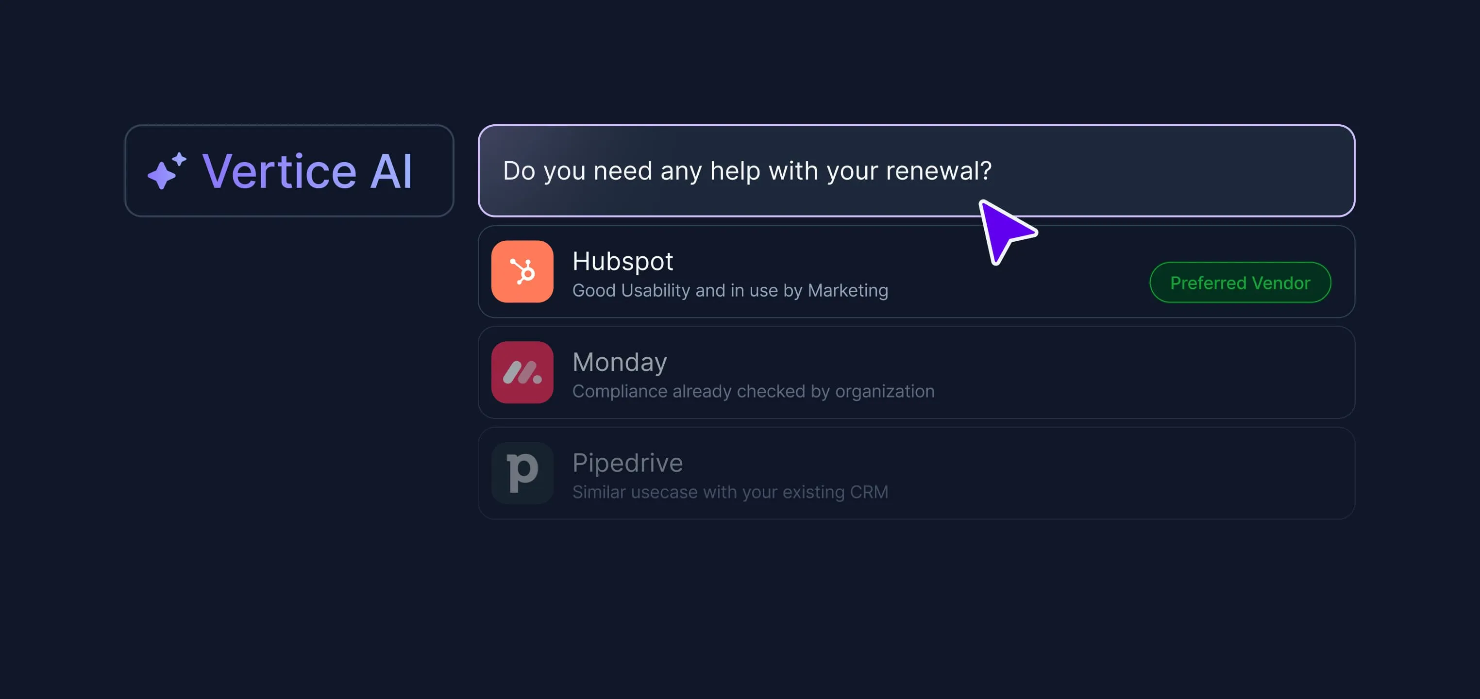 Vertice leverages automated workflows to simplify purchase requests, approvals, and renewals. By reducing manual steps and email chains, these workflows accelerate procurement, improve spend management, and help teams maintain control over rising software costs while ensuring purchases are consistent, compliant, and optimized for business needs.